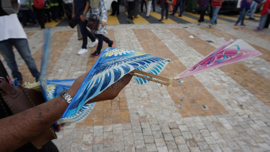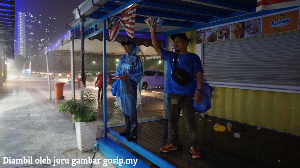 Penjual: “Siapa nak baju hujan? RM5 setiap satu.”Keadaan pintu masuk sebelah Axiata Arena