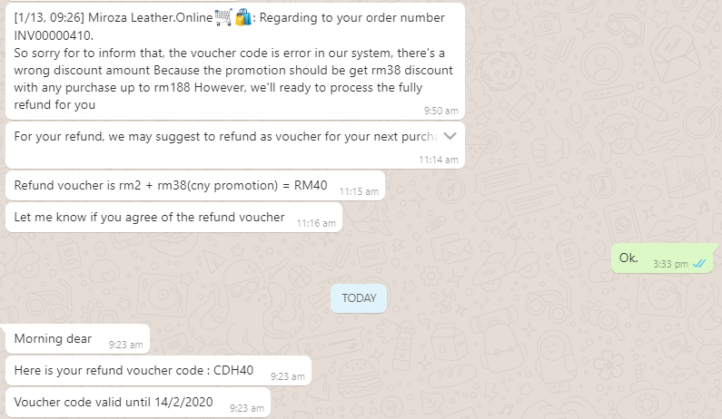 βΌTIDAK. Pada 13HB hari Isnin, hari bekerja pertama minggu ini, Miroza telah membatalkan pesanan tersebut and balas bahawa mereka boleh pulangkan duit atau memberikan kod baucar bayaran balik untuk pembelian seterusnya. Saya pilih baucar.