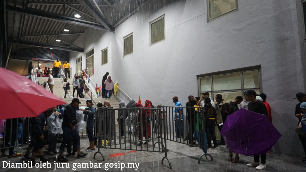 Hujan lebat tetapi muzik dimainkan dan para pengunjung nampak masih semangat di sekeliling pintu masuk VVIP